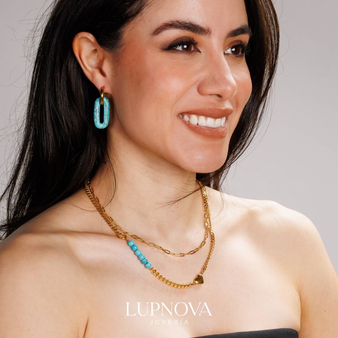 Collar de acero inoxidable con baño de oro 18k, diseño en capas que combina cadena papelclip y cadena cubana, detalle de cuentas turquesa y dije de corazón. Hipoalergénico, resistente al agua y al deslustre; ideal para hacer layering o llevar solo. Un básico versátil para elevar looks casuales y de noche. Encuéntralo en Lupnova Joyería. La cadena tiene un largo de 40cm más extensión de 5cm.