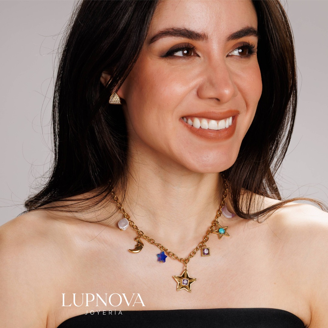 Collar de acero inoxidable con baño de oro 18k y charms de estrellas, lunas y mini piedras sobre cadena tipo eslabón. Diseño moderno, hipoalergénico, resistente al agua y con largo ajustable: ideal para layering o lucir solo. Un collar de charms dorado perfecto para darle brillo celestial a tus looks diarios y de noche. Disponible en Lupnova Joyería. La cadena tiene un largo de 40cm más una extensión de 5cm.