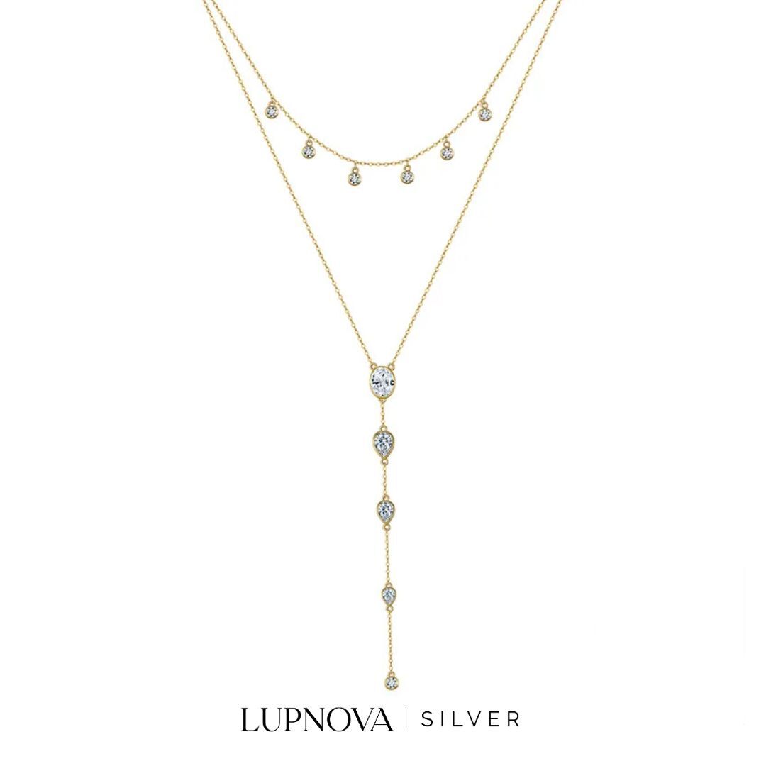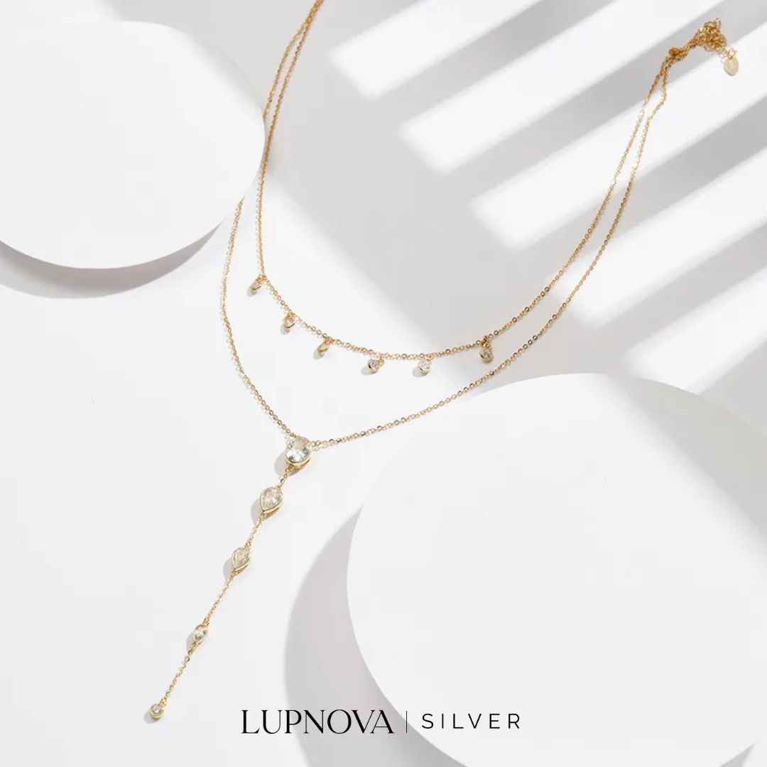 Collar de capas, elaborado cuidadosamente en plata925 con baño de oro de 14k, elevará tu elegancia al instante. Decorado con brillantes incrustaciones de zirconia cuidadosamente colocadas en sus delicadas capas, su diseño genera un encantador efecto de cascada. Perfecto para ocasiones especiales o para aportar sofisticación a tu estilo diario, este collar combina lujo atemporal con un encanto moderno. La cadena interior tiene un largo de 38 centímetros, la cadena externa tiene un largo de 42 centímetros, el colgante mide 9 centímetros. Tiene una extensión de 5 centímetros, Las capas no pueden usarse por separado. Material Plata925.