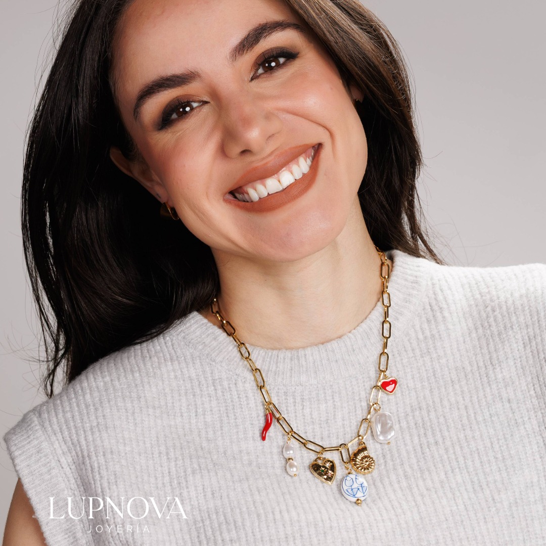 Collar de acero inoxidable con baño de oro 18k tipo cadena papelclip, adornada con charms: corazón esmaltado, perlas barrocas, concha, pieza de cerámica pintada, corazón grabado y cuerno de la suerte. Ajustable, hipoalergénica y resistente al agua; perfecta para layering o llevar sola. Una cadenade charms dorada que añade estilo mediterráneo y buena vibra a cualquier look. Encuéntrala en Lupnova Joyería.La cadena tiene un largo de 45cm más extensión de 5cm.