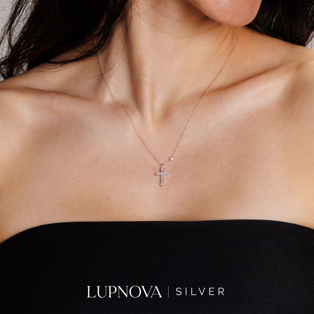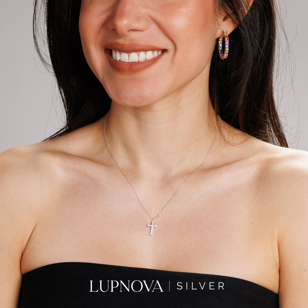 Collar con dije de cruz en plata 925 con baño de rodio y brillantes circonias cúbicas, acompañado de un detalle solitario en la cadena. Un collar de cruz minimalista y elegante, perfecto para uso diario, regalos especiales o como pieza de fe siempre contigo. Forma parte de la colección Lupnova Silver. La cadena tiene un largo de 42 centímetros más una extensión de 5cm. El dije tiene un ancho de 1cm y un alto de 1.8cm