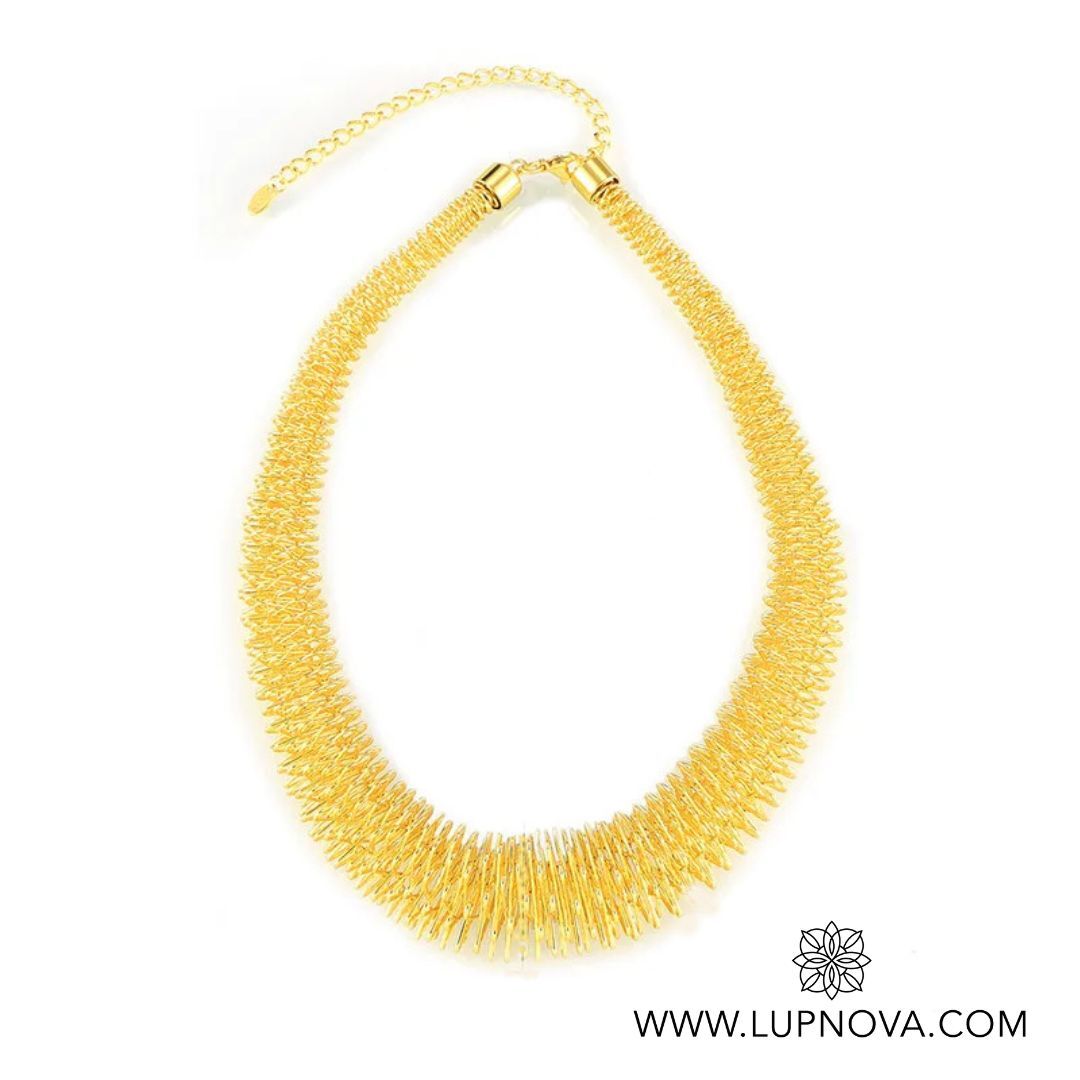 Haz una declaración de estilo con nuestro collar Golden Whirl, una pieza audaz elaborada en acero inoxidable con un elegante baño de oro de 18k. Su diseño entrelazado, voluminoso y altamente brillante lo convierte en el accesorio ideal para destacar en eventos especiales o elevar un outfit sencillo con un toque sofisticado. El collar tiene un largo de 40cm más una extensión de 10cm. Material acero inoxidable.