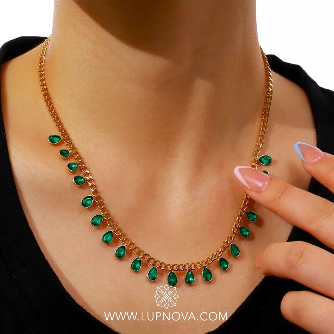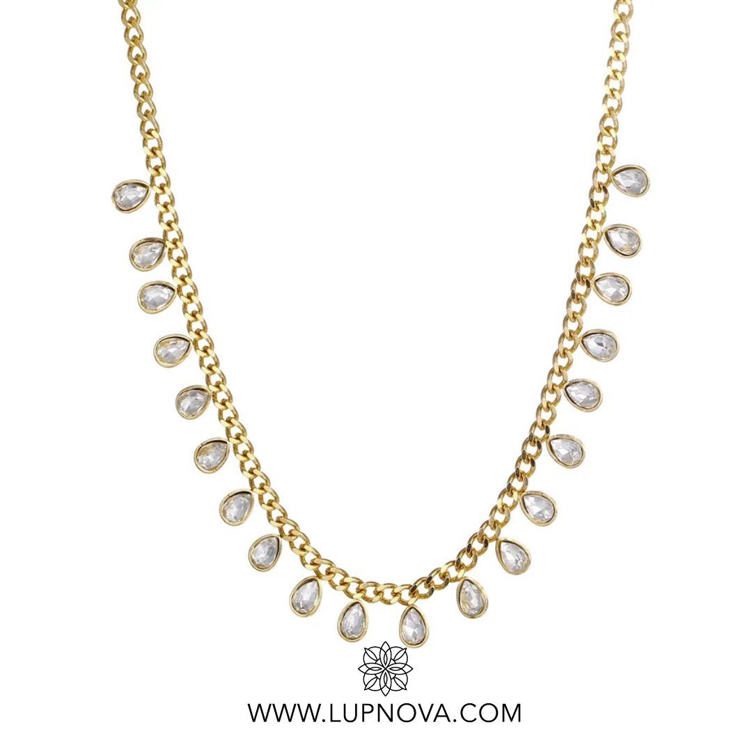 El collar Gotas Encantadas está elaborado en acero inoxidable con baño de oro de 18k y adornado con delicadas lágrimas de circonia cúbica que cuelgan sutilmente a lo largo de su cadena tipo cubana. Su diseño evoca gotas de rocío brillando bajo el sol, aportando un toque sofisticado, moderno y femenino.