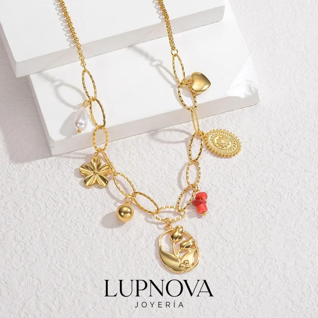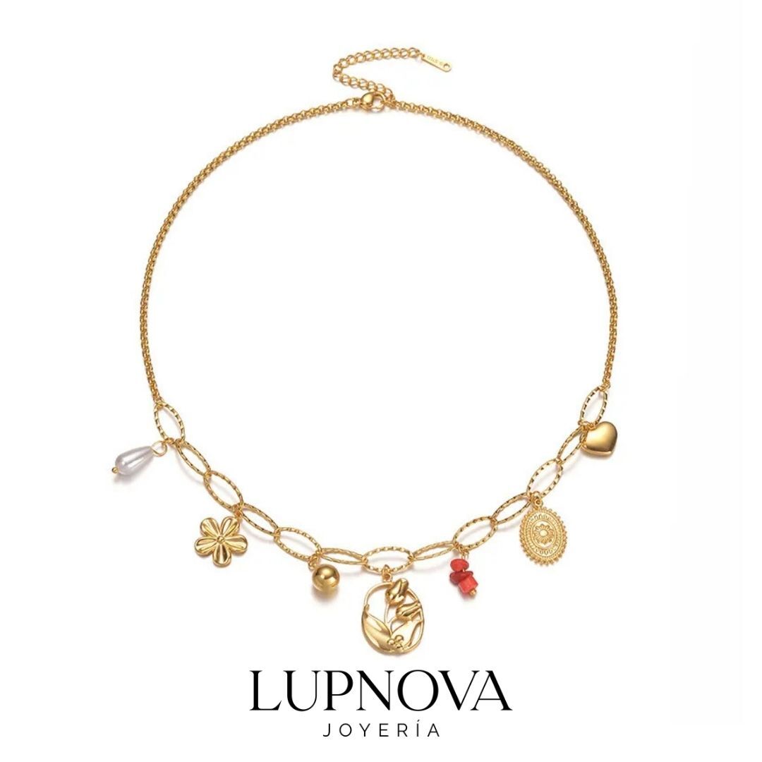 Collar en acero inoxidable con baño de oro 18k sobre cadena de eslabón ovalado. Cuenta con siete dijes únicos: perla gota, flor, esfera, medallón floral, piedras rojas, medallón grabado y corazón. Una pieza llena de personalidad y simbolismo, perfecta para regalar o lucir como accesorio principal. Resistente al desgaste y apto para pieles sensibles. Disponible en Lupnova Joyería. La cadena tiene un largo de 42cm más una extensión de 5cm.