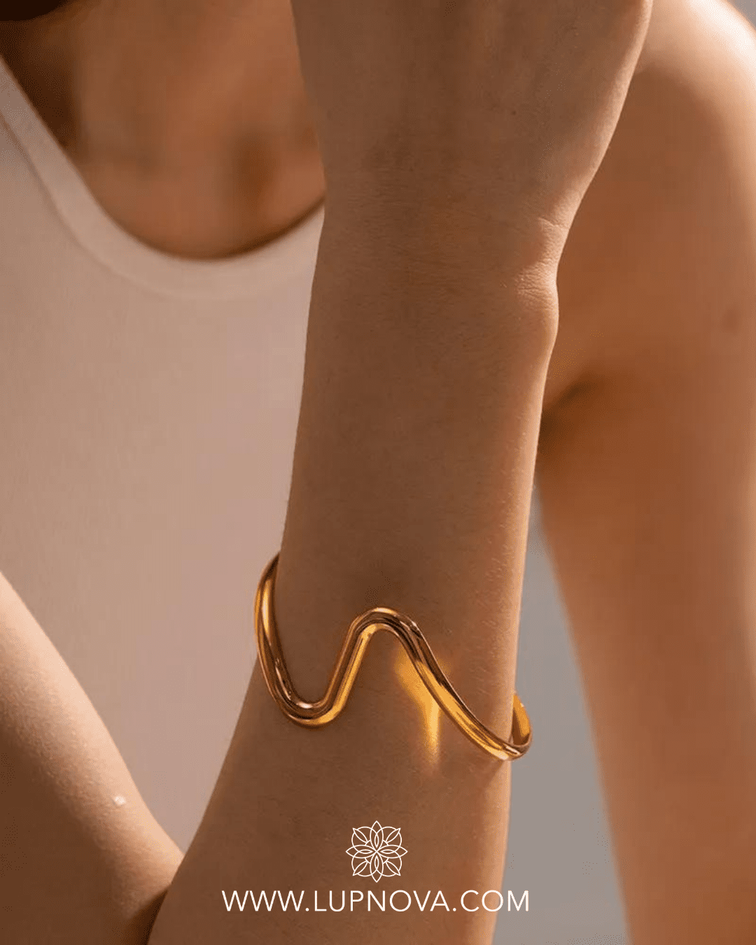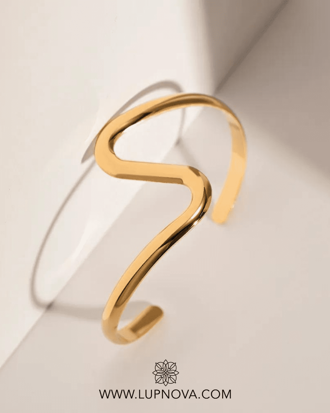 Pulsera tipo cuff con forma de S. Material acero inoxidable con baño de oro 18k.