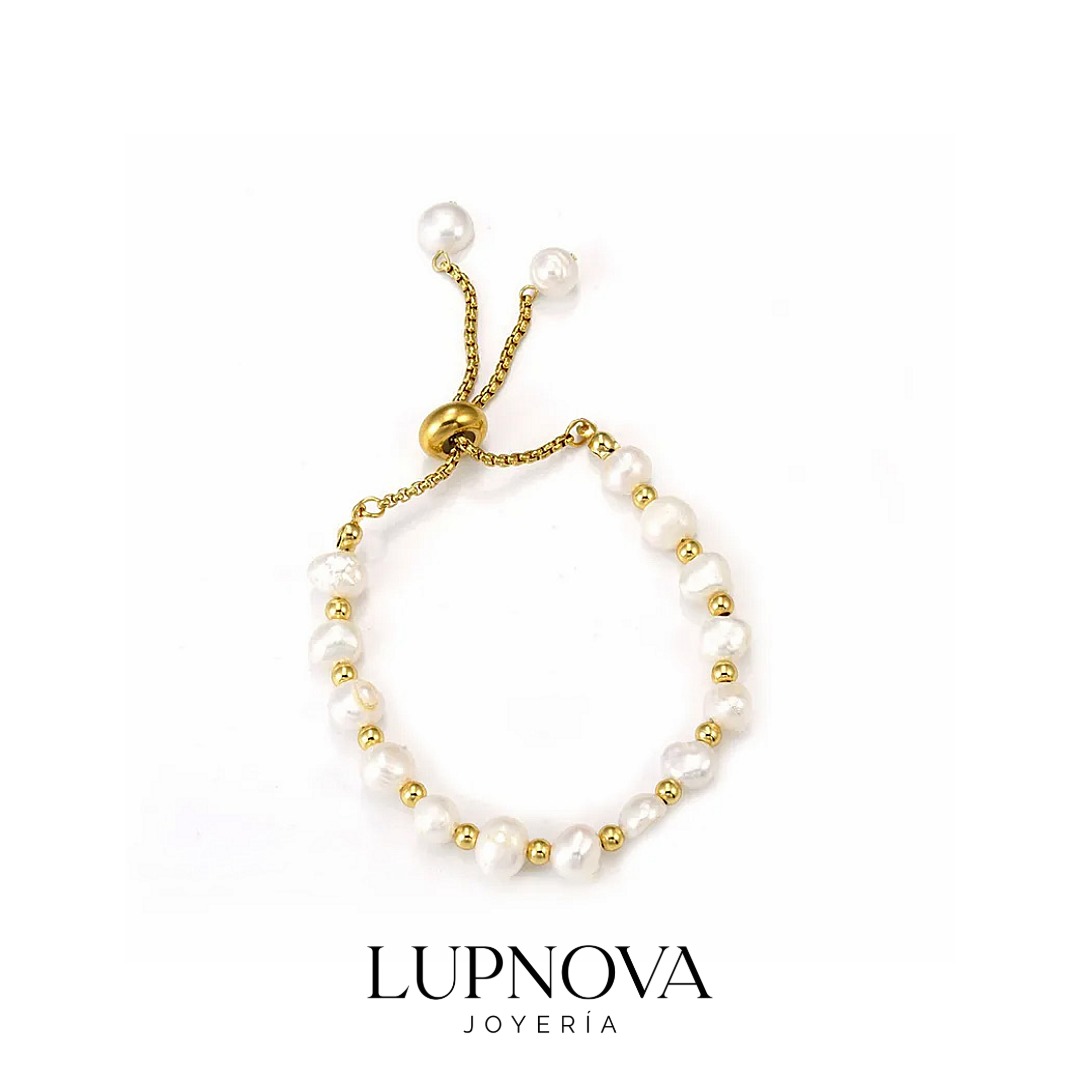 Pulsera ajustable tipo slider con delicadas perlas y detalles dorados, perfecta para un look elegante y minimalista. Elaborada en acero inoxidable, es resistente, cómoda y ideal para usar a diario o para ocasiones especiales. Combínala sola o en layering para un toque sofisticado.