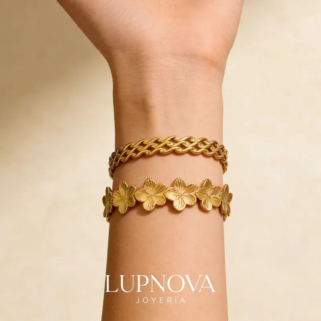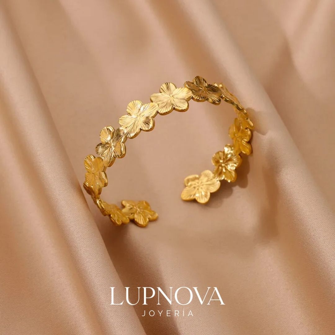 Brazalete abierto en acero inoxidable con baño de oro 18k, formado por flores texturizadas enlazadas que rodean la muñeca en un diseño delicado y romántico. Su acabado dorado mate le da un carácter artesanal y atemporal. Perfecto para looks de primavera, verano o como regalo especial. Apto para pieles sensibles. Disponible en Lupnova Joyería. La pulsera tiene un diámetro de 5.5cm y es ajustable.