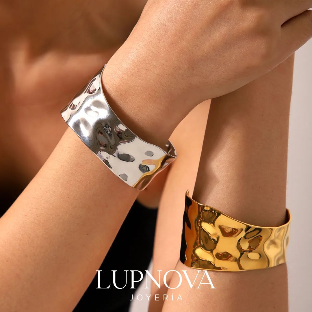 Brazalete cuff abierto de acero inoxidable con acabado ondulado tipo martillado y brillo espejo. Diseño moderno y minimalista, hipoalergénico, resistente al agua y al deslustre. Ajuste cómodo para muñeca y perfecto para usar solo o en stacking. Un imprescindible para elevar cualquier look en Lupnova Joyería. Diámetro interno de 6.5cm. La pulsera se puede ajustar.