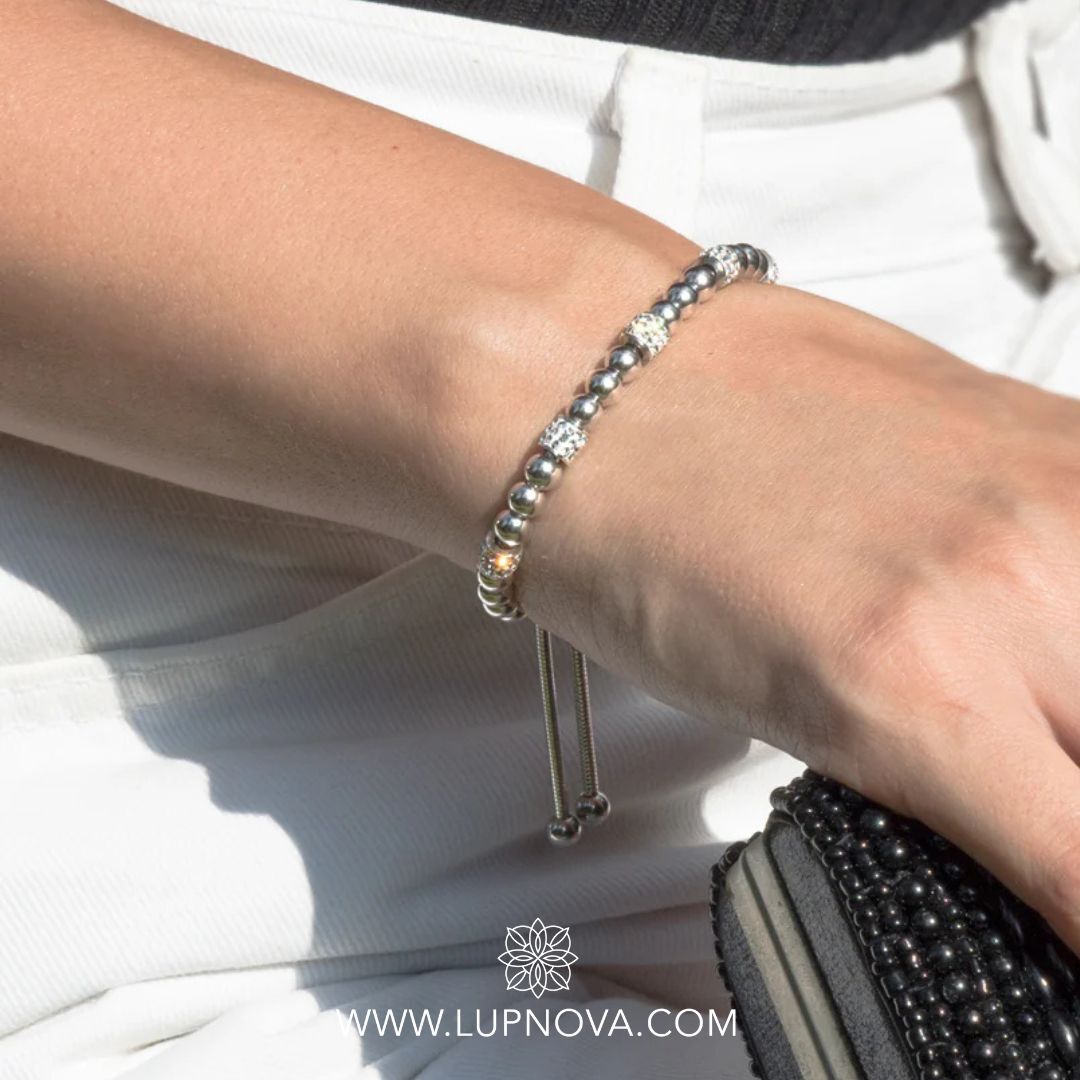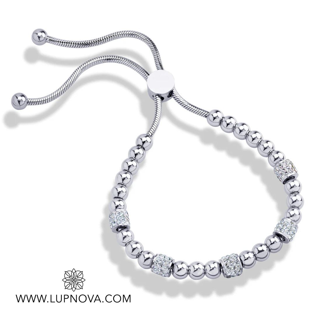 Este brazalete presenta un diseño elegante y versátil, que combina cuentas metálicas pulidas con deslumbrantes acentos de cristal para un toque de elegancia. El cierre deslizante ajustable garantiza un ajuste perfecto, convirtiéndolo en una pieza tanto estilizada como funcional. Material acero inoxidable.