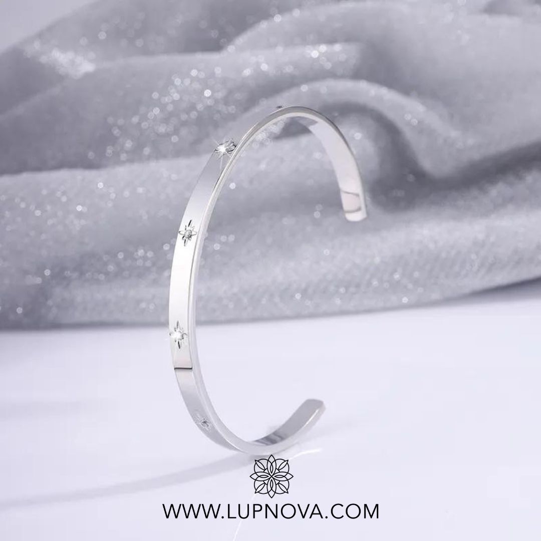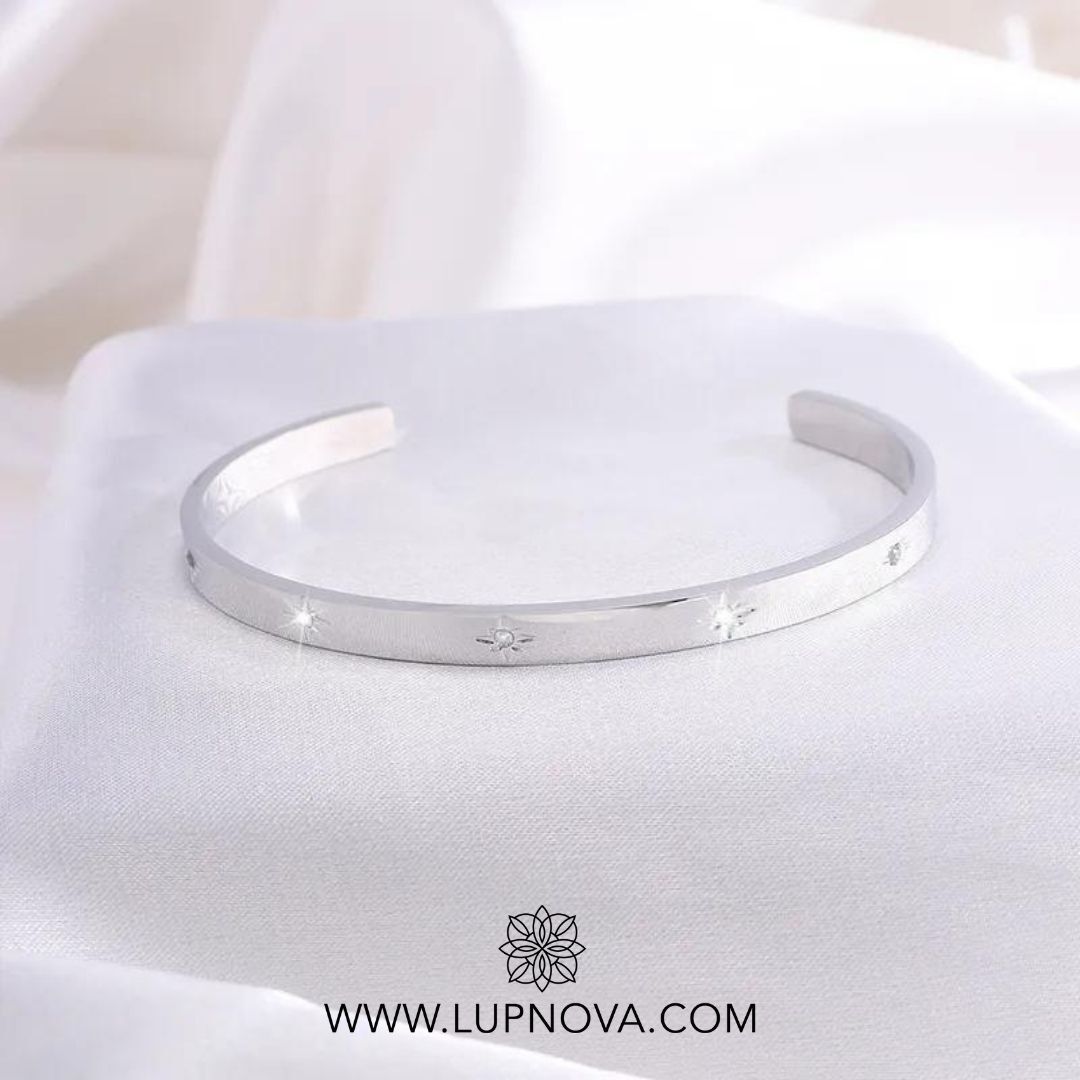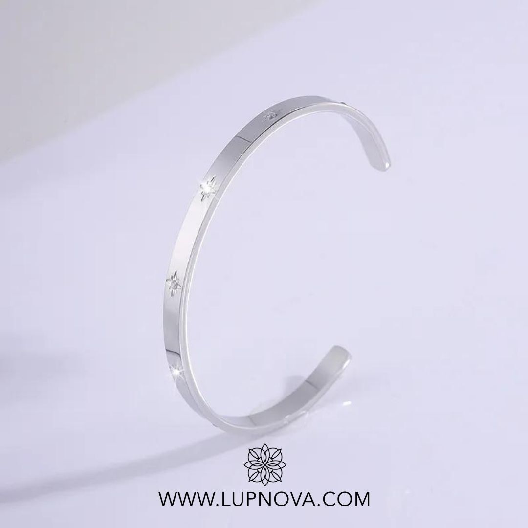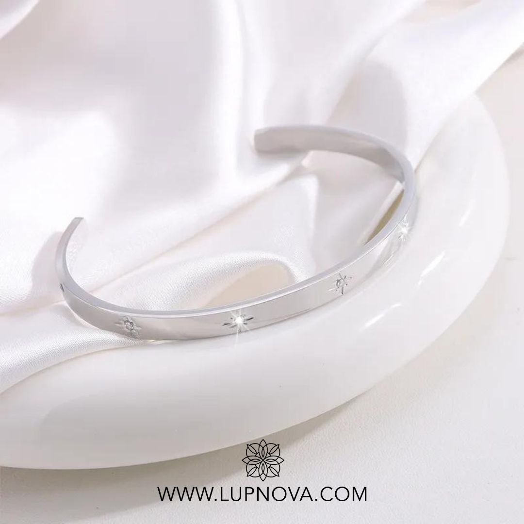 Pulsera con inserción de estrella de circonia cúbica. La pulsera tiene un diámetro de 6cm que puede ser ajustado. Material acero inoxidable.