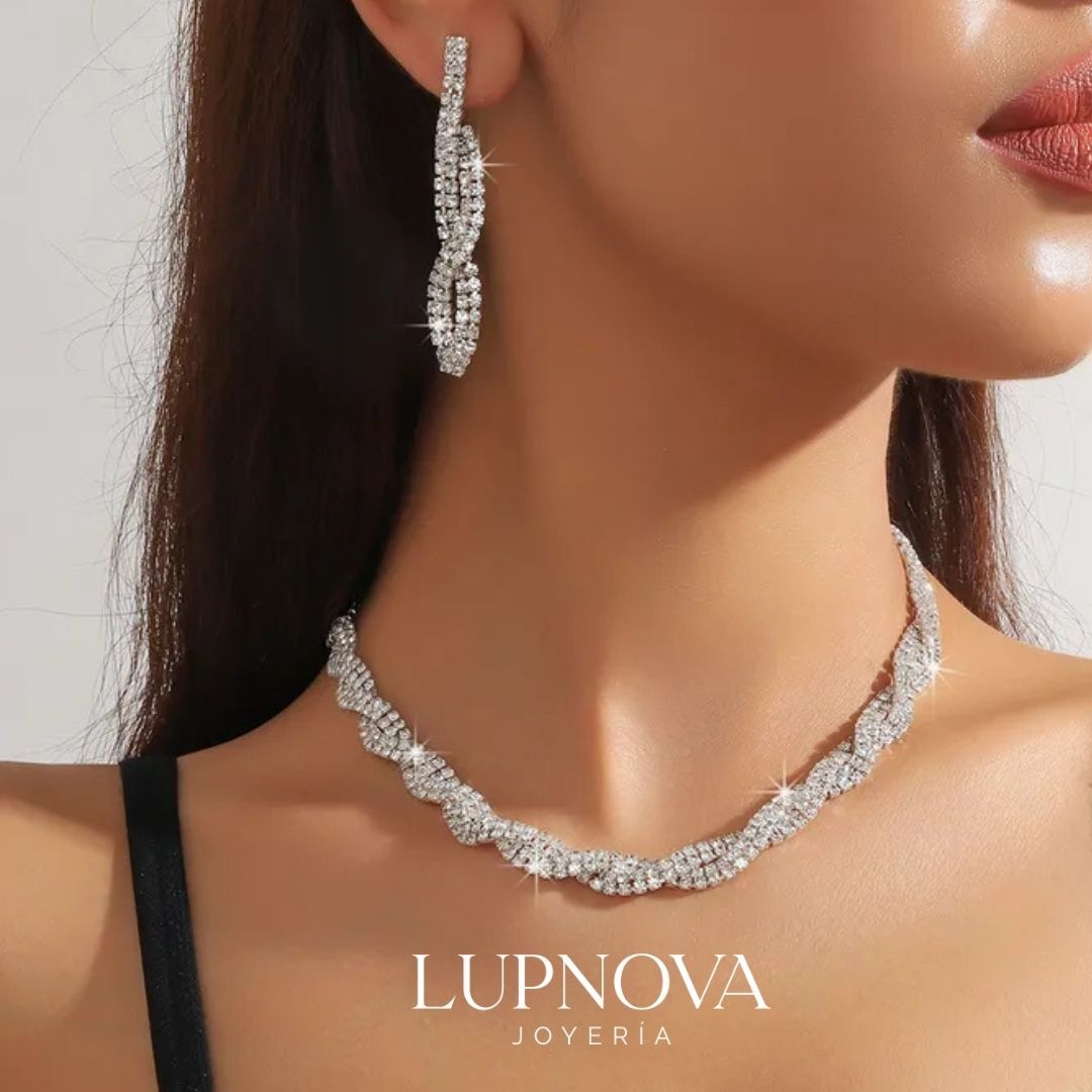 Set para fieste de collar y aretes con diseño entrelazado. Los aretes tienen un ancho de 1cm y largo de 6.5cm. El collar tiene un largo de 40cm, más una extensión de 15cm.